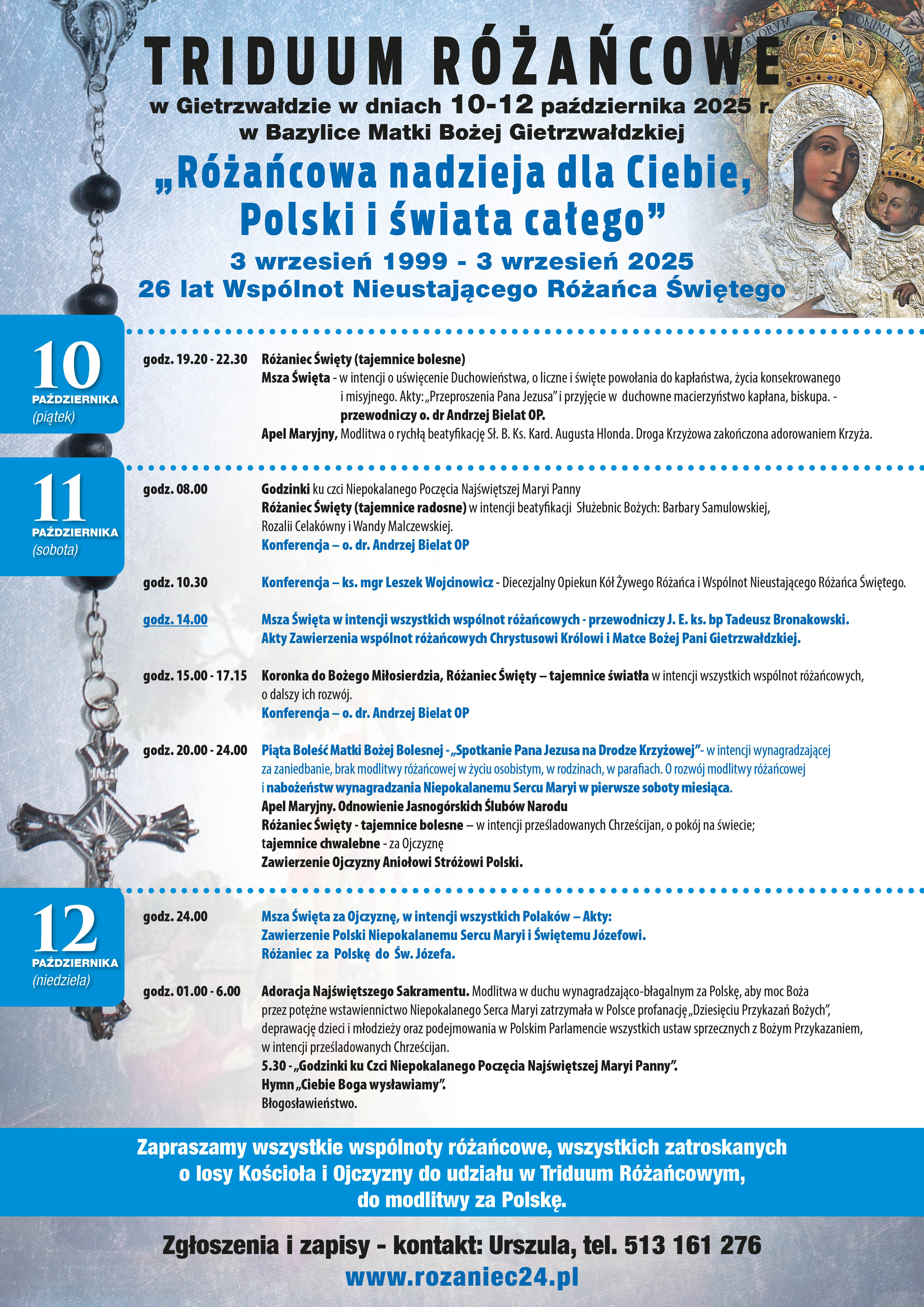 w dniach 10 – 12 października br. w sanktuarium Matki Bożej w Gietrzwałdzie odbędzie się doroczne 26 Triduum Różańcowe pod hasłem: „Różańcowa nadzieja dla Ciebie, Polski i Świata całego”.
