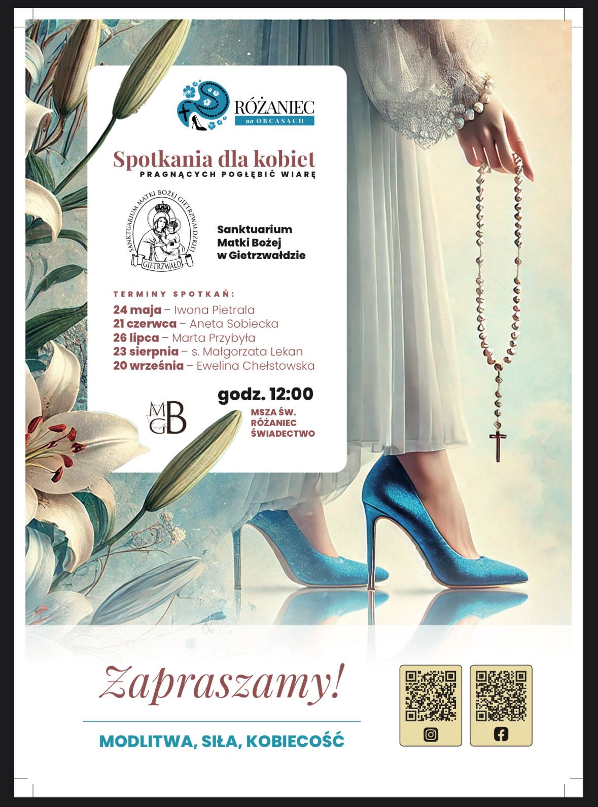 1) Zapraszamy wszystkie kobiety na cykl spotkań „Różaniec na obcasach", odbywających się w Sanktuarium Matki Bożej w Gietrzwałdzie.