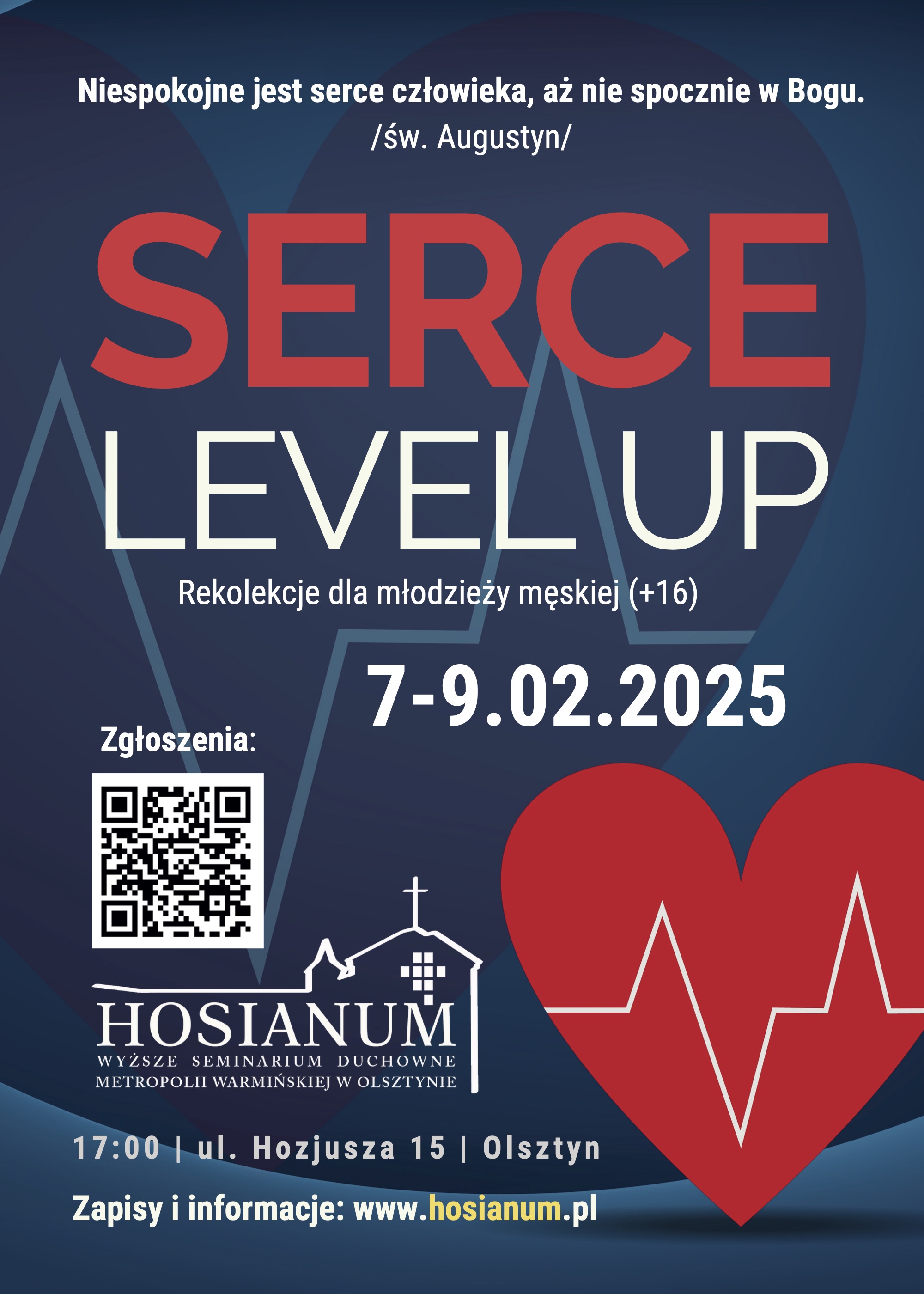 Wspólnota Wyższego Seminarium Duchownego Metropolii Warmińskiej HOSIANUM w Olsztynie serdecznie zaprasza na rekolekcje powołaniowe „SERCE LEVEL UP", które odbędą się w dniach 7-9 lutego 2025 roku w budynku Seminarium Duchownego w Olsztynie/Redykajny.